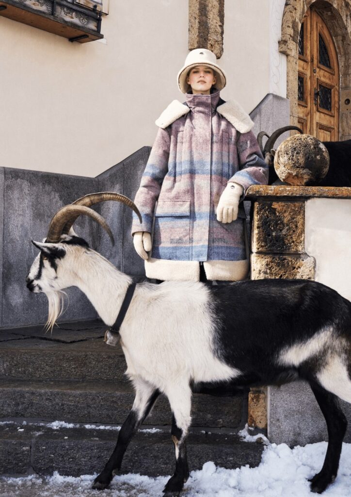 メタリック素材のスキースーツ、ダウンジャケット、毛足の長いシアリングのブルゾンやコート、リフレクティブディテールを取り入れた撥水性のジャンプスーツやトラウザーが揃います。